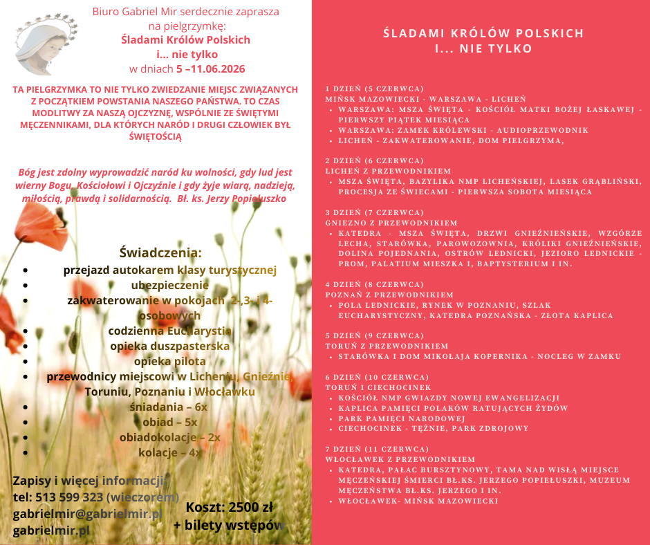 6:00 – Zbiórka: Parafia Narodzenia NMP w Mińsku Mazowieckim, Kościelna 1, 05-300 Mińsk Mazowiecki
